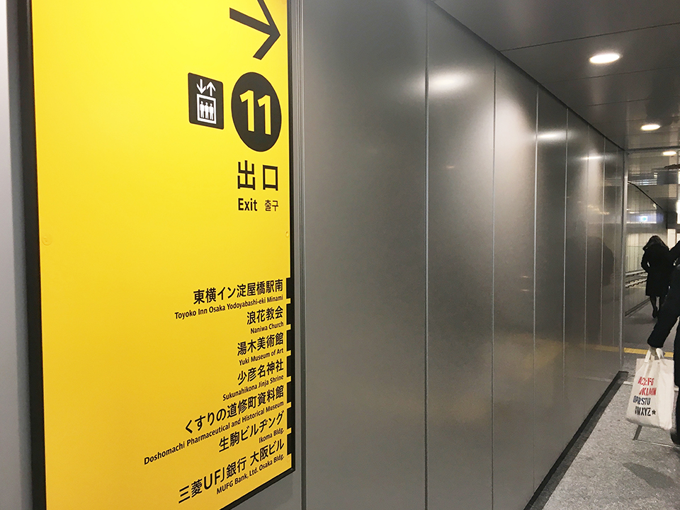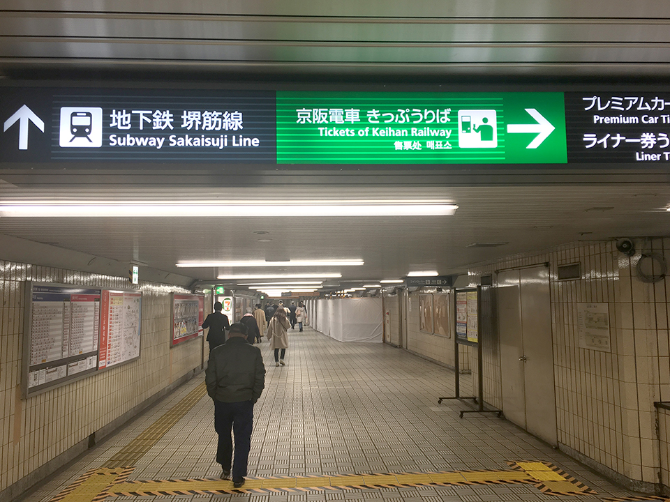 大阪メトロ堺筋線 北浜駅の6号出口を目指します。まずは改札を出て、堺筋線の北浜駅方面に向かいます。
